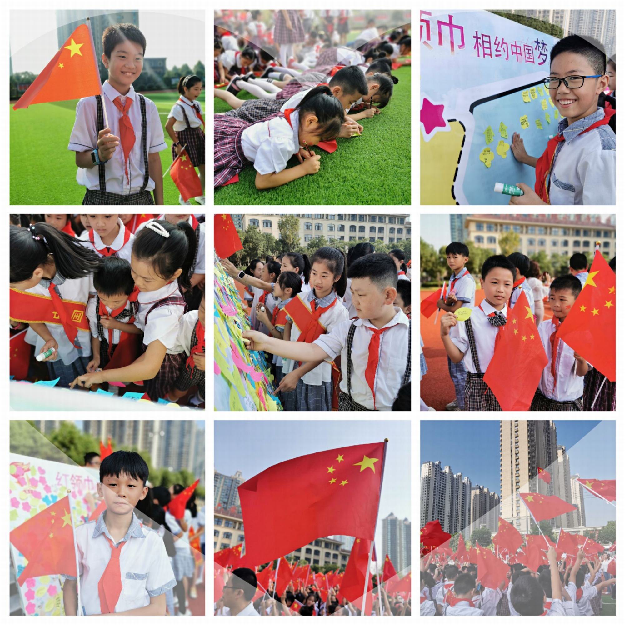 “我和我的祖国,一刻也不能分割,无论我走到哪里,都流出一首赞歌……”伴随着熟悉的旋律,各中队委的队员们手持国旗,聚集在操场。他们挥动着五星红旗,快闪齐唱《我和我的祖国》,歌唱祖国、传递温暖,共同庆祝中华人民共和国成立70周年。