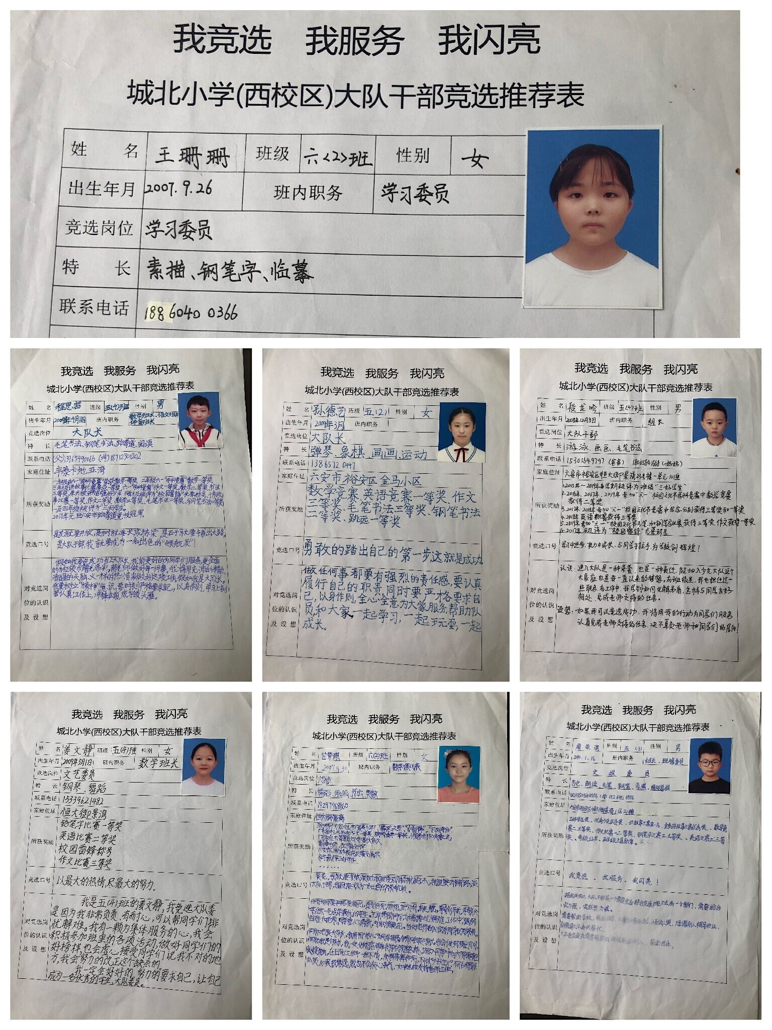 快来看看小小候选人们填写的申请表吧,真是新意百出,丰富多彩!这不仅将城北精神风貌展现得淋漓尽致,还充分表达了队员们对少先队工作的热忱以及做好工作的决心。