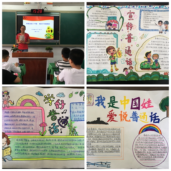 学校通过悬挂横幅、张贴标语、布置展板等形式,宣传推广普通话、书写规范字的重要意义,营造良好的学习氛围。各班级通过开展主题班队会、制作推普手抄报等形式,使学生对规范运用语言文字有了正确的认识,同时也让孩子们感受到了祖国语言文字的魅力。