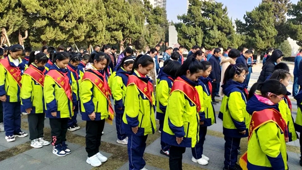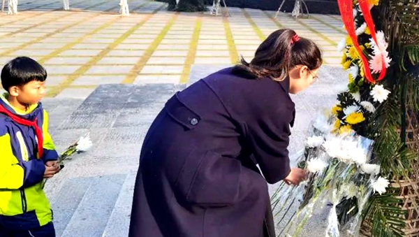 在庄严肃穆的烈士纪念碑前,在雄壮的国歌声中,全体师生沉重悼念革命先烈,党员代表和少先队员代表向烈士敬献鲜花,向在南京大屠杀惨案中不幸罹难的30万同胞、为国捐躯的英烈们三鞠躬默哀。