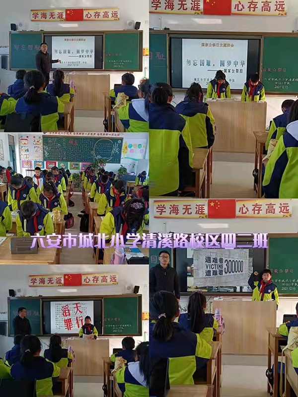 2021年12月13日,云霭沉沉,天地同哀。今天是第八个南京大屠杀死难者国家公祭日。为了深切缅怀死难同胞,铭记痛入髓骨的历史,激发学生的爱国情怀,六安市城北小学清溪路校区结合校情,开展了“不忘国耻,公祭英灵”的主题纪念活动。
