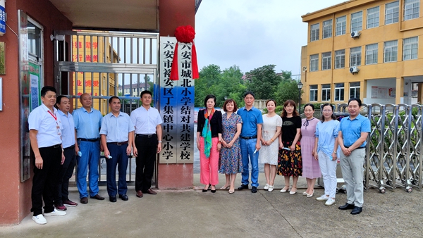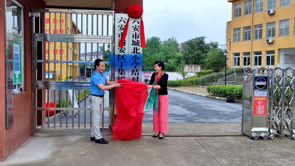 见面会后,在与会六十余人的共同见证下,六安市城北小学校长高兰和丁集镇中心学校校长刘余生共同为“六安市城北小学结对共建学校”揭牌。