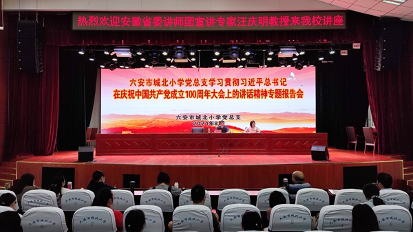 8月27日上午,六安市城北小学党总支在演播厅举办学习贯彻习近平总书记在庆祝中国共产党成立100周年大会上的讲话精神专题报告会。