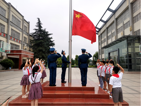 升旗仪式伊始,中国人民解放军94619部队的护旗手与学校国旗班的孩子们护卫着鲜艳的五星红旗,齐步走向升旗台。在激昂的《义勇军进行曲》中,升旗手振臂一挥,鲜艳的五星红旗徐徐展开,迎着飒飒的秋风缓缓上升......