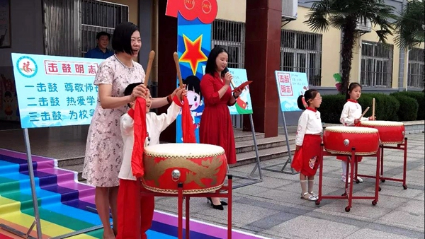 仪式伊始,裕安区委教育工委委员、城北小学党总支书记、校长高兰代表全体教师与五名新生代表共同敲响“启智鼓”,铿锵的鼓声代表着学校对孩子们最美好的祝愿。
