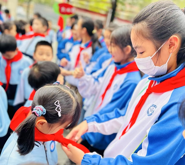 随后,六年级的少先队员代表们手捧鲜艳的红领巾,迈着整齐的步伐走向新队员。他们细心地为小弟弟、小妹妹们系上人生的第一条红领巾,并互敬队礼。这一刻,传承与责任在无声中传递,鲜艳的红领巾在新队员的胸前飘扬,仿佛一团团跳动的火焰,点燃了他们心中的骄傲与责任。