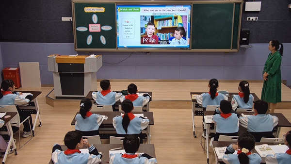 热身启趣,激活语言能力:一首欢快的“best friends”主题歌曲,迅速拉近师生距离,随后“Who's your best friend?”“Who's Sarah's best friend?”等问题层层深入,引导学生主动运用英语表达,初步激活语言运用能力。