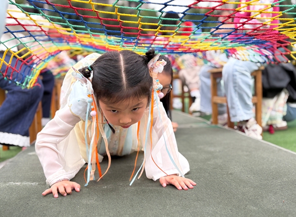 紧接着,活动场地转移至操场。“重走长征路”挑战火热开启。操场化身为模拟长征路线,设置了“滑索前行”“穿越火线”“翻山越岭”三个富有挑战的关卡。大小孩子们混合编组,相互扶持,协同闯关。在汗水中,亲身体验了长征途中的艰难险阻,深刻感悟了革命先辈不畏艰险的意志与团队协作的强大力量。