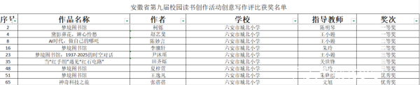 书香浸润心灵,阅读点亮童年。近日,安徽省第九届校园读书创作活动创意写作评比结果揭晓,六安市城北小学学子凭借丰富的想象力、扎实的文字功底与深刻的思想内涵,在全省众多参赛作品中脱颖而出,荣获一等奖2人、二等奖2人、三等奖3人、优秀奖2人。