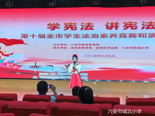 为深化青少年宪法法治教育,普及宪法法治知识,培育宪法法治观念,弘扬宪法法治精神,9月9日,第十届六安市学生“学宪法 讲宪法”活动在皋城小学举行。经过激烈的角逐,六安市城北小学六(4)中队孙雨欣同学斩获法治素养竞赛一等奖,六(9)中队赵艺斐同学荣获演讲比赛二等奖,河西小学六(7)中队李露瑶同学获得演讲比赛三等奖;其中孙雨欣同学将代表六安市参加省级比赛。