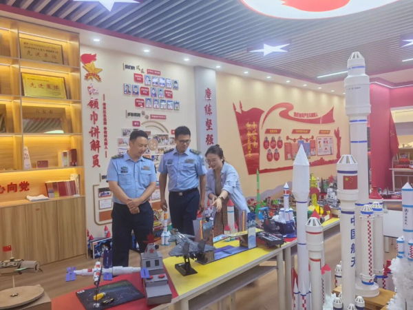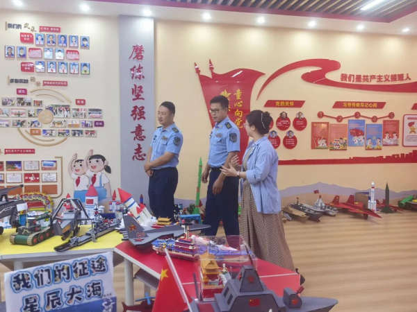 活动中,共建部队一行走进学校思政室,参观了“雏鹰”少年军校国防教育阵地,观看了孩子们的国防教育手工作品展。一件件构思巧妙、创意十足的歼-20、坦克、国产航母、长征火箭等国防装备模型,引得官兵们不时驻足,点头称赞。