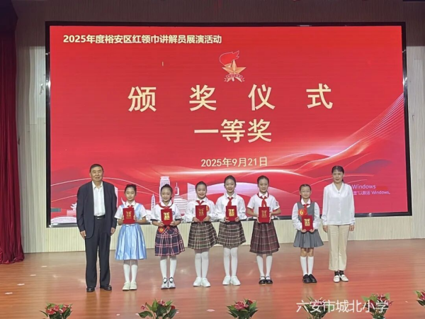 为充分发挥裕安区厚重的历史、文化和红色资源优势,引导广大少先队员厚植爱党、爱国、爱社会主义的情感,9月21日,“强国复兴有我 争当新时代好少年”2025 年度裕安区红领巾讲解员展演活动在裕安区齐云路小学举行。经过视频初赛选拔和现场决赛角逐,六安市城北小学程嘉格同学荣获一等奖第一名,六安市城北小学教育集团河西小学张依晨同学获得三等奖。