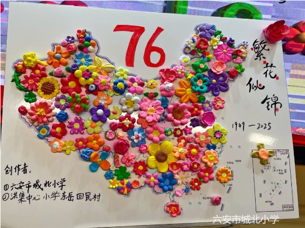 队课还设置了“繁花中国”泥彩互动环节。在巴老师的指导下,东岳回民村的小朋友们围坐在一起,发挥巧手和巧思,捏制出一枚枚形态各异的花朵,并将其贴在中国地图轮廓板上,与城北小学队员们提前制作的花朵汇聚在一起,勾勒出一幅“繁花映山河”的生动图景,共同祝福伟大祖国繁花似锦。