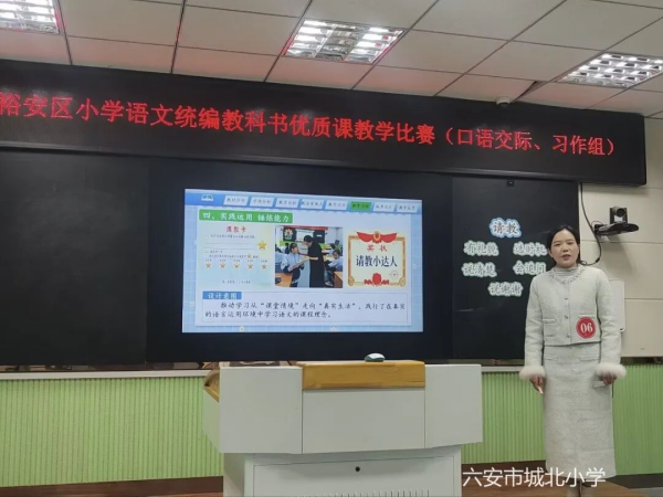 经过说课、上课的层层选拔,六安市城北小学巴丹丹老师斩获阅读组一等奖第一名、朱玲老师获得古诗文组一等奖、龚俊老师获得口语交际组二等奖,六安市城北小学教育集团裕安区河西小学金美玲老师斩获古诗词组一等奖第一名、吕莹老师获得阅读组一等奖,金马小学王静静老师获得阅读组二等奖、陈晓蕾老师获得口语交际组三等奖,其中巴丹丹、金美玲两位教师将代表裕安区参加市级比赛。